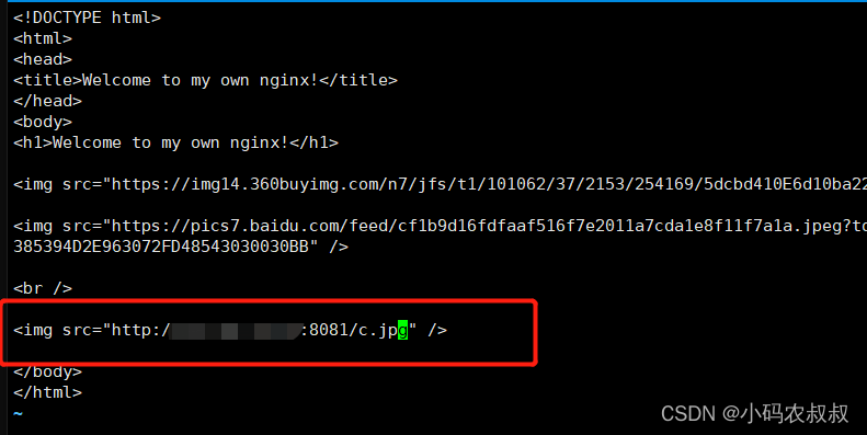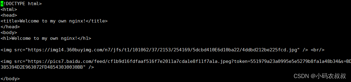 接下來(lái),利用上面的這兩個(gè)圖片鏈接,我們?cè)趎ginx的資源目錄下,創(chuàng)建一個(gè)html頁(yè)面,將這兩張圖片的鏈接設(shè)置進(jìn)去
