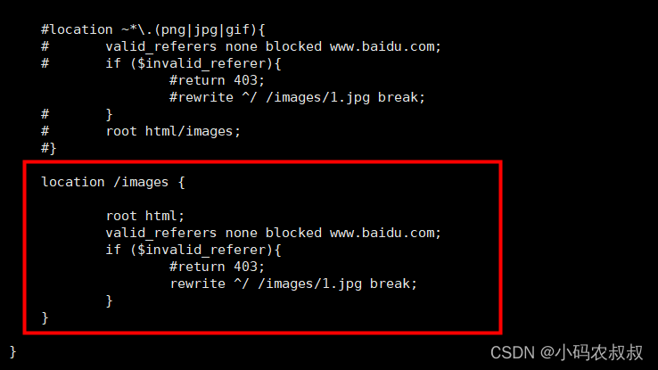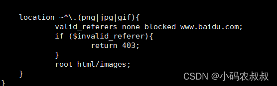 為了實(shí)現(xiàn)防盜鏈功能,只需要在上面的nginx.conf配置中添加如下內(nèi)容