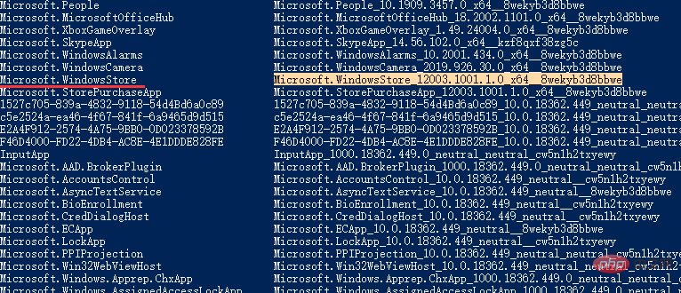 3、在出現(xiàn)的列表中找到“Microsoft.WindowsStore”這個(gè)應(yīng)用,然后復(fù)制右側(cè)對(duì)應(yīng)的包名稱。不同系統(tǒng)的包名稱可能會(huì)不一樣,但是沒(méi)有關(guān)系,復(fù)制即可。