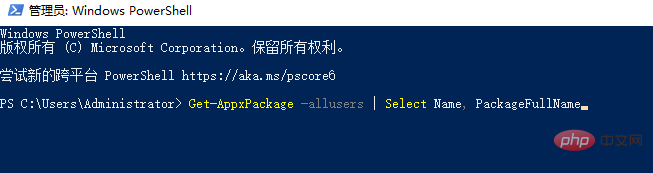 2、在管理員windows powershell窗口輸入【Get-AppxPackage -allusers | Select Name, PackageFullName】然后按下回車(chē)鍵。
