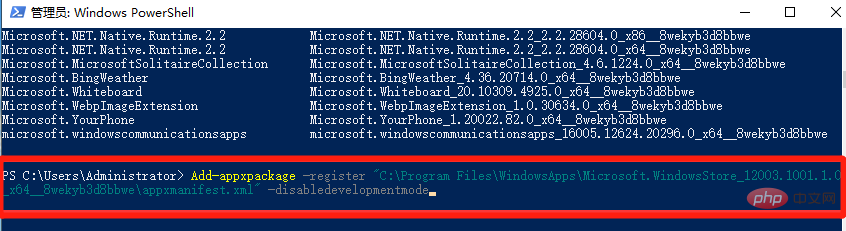 4、把剛復(fù)制的代碼,套入下面的命令中【Add-appxpackage -register "C:\Program Files\WindowsApps\WindowsStore右邊的包名稱\appxmanifest.xml" -disabledevelopmentmode】,如下圖所示,然后按下回車(chē)運(yùn)行等待系統(tǒng)部署完成就可以了。