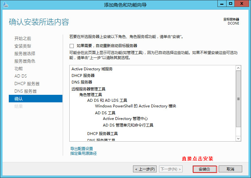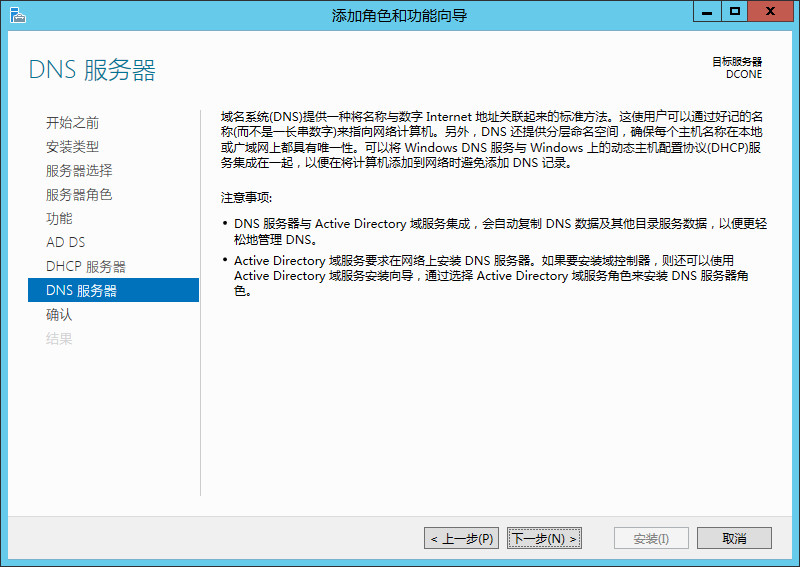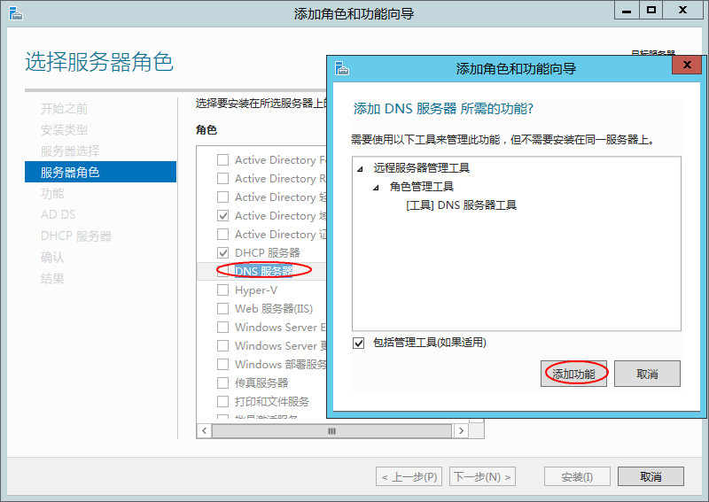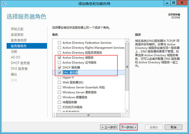 3.首先開始第一臺服務器的AD+DHCP+DNS的搭建,因為在添加服務器角色的時候,可以同時選取,所以三項可以同時選取并進行安裝。