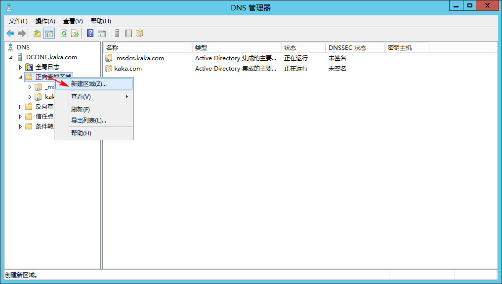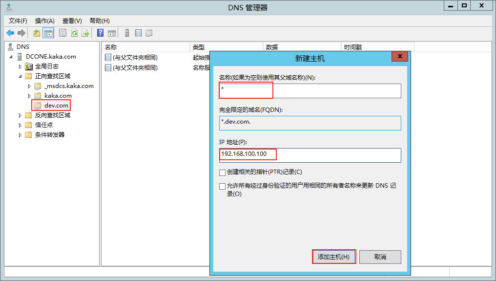 5.現(xiàn)在這里在DNS里面做一條簡單的條目,以便一會在配置完成DCTWO的時候做驗證,因為如果兩臺DC互為冗余配置完成以后,DNS條目會自動同步過去。所以可以做驗證。